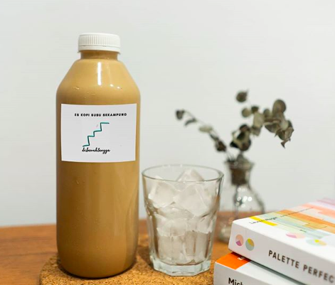 Menu andalan kopi Di Bawah Tangga yaitu es kopi sekampung kini dapat Anda nikmati berkali-kali karena tersedia dalam kemasan besar. Rasanya yang creamy pas sekali jika dihidangkan dalam gelas berisi es batu. Dapat dibeli di gerai Gandaria City, De Entrance Arkadia, GrandLucky SCBD, Antasari serta pemesanan via Tokopedia.