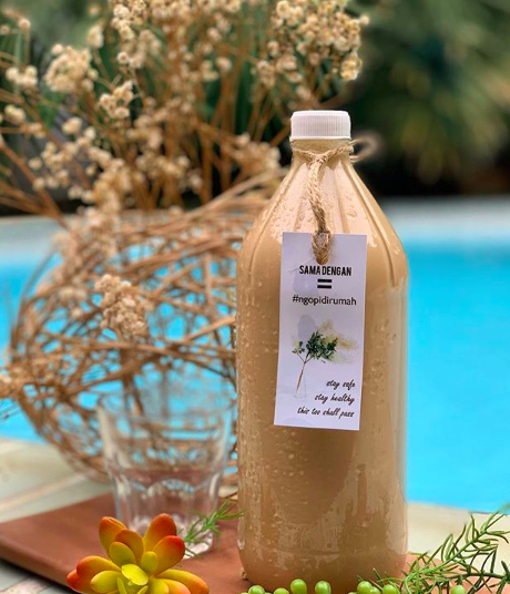 Agak berbeda dari yang lain, kopi satu liter dari Sama Dengan hadir dalam botol kaca yang nantinya bisa Anda gunakan kembali. Premium latte yang baru dibuat setelah Anda memesan bisa didapatkan melalui Tokopedia dan Goshop. Pengiriman hanya tersedia untuk area Jakarta.