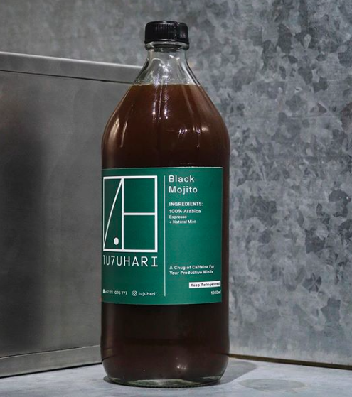 Empat varian minuman kopi dan non kopi berukuran satu liter dapat ditemukan di sini yaitu kopi susu harian, black mojito, matcha latte, dan kopi susu harian coconut. Keempatnya dapat bertahan selama 4-5 hari asal disimpan di dalam lemari pendingin. Pemesanan minuman dapat dilakukan via Tokopedia atau direct message akun Instagram Tujuhari.