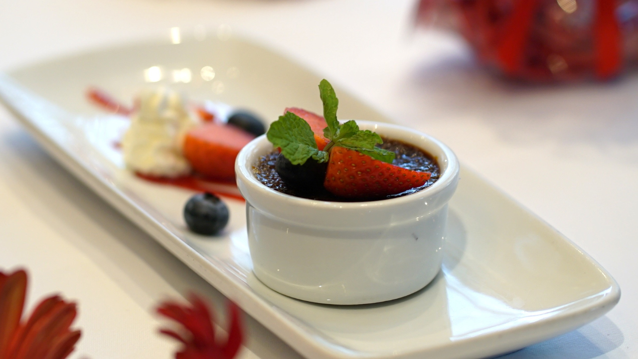Sebagai kudapan, Chocolate Crème Brûlée disajikan untuk mencuci mulut. Kudapan ini terinspirasi dari crème brûlée klasik Ruth’s Chris. Aksentuasi cokelat hitam memberikan aroma kacang yang unik, bersanding sempurna dengan lapisan karamel yang renyah dan tekstur lembut custard di dalamnya. Kecut raspberry segar melengkapi rasa manis dengan berimbang.