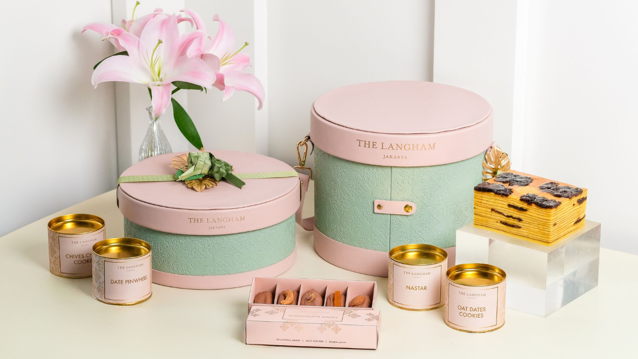 The Langham juga menyiapkan bingkisan lebaran dalam pilihan kotak berwarna merah jambu atau hijau saga nan cantik. Terdapat dua pilihan bingkisan sesuai dengan selera Anda: Eid Hamper, berisi empat toples kue kering, kue Lapis Legit yang khas, serta kurma medjool berisi yang dilapis oleh cokelat; serta Raya Hamper, berisi empat toples kue kering khas Lebaran seperti nastar dan kaastengels.