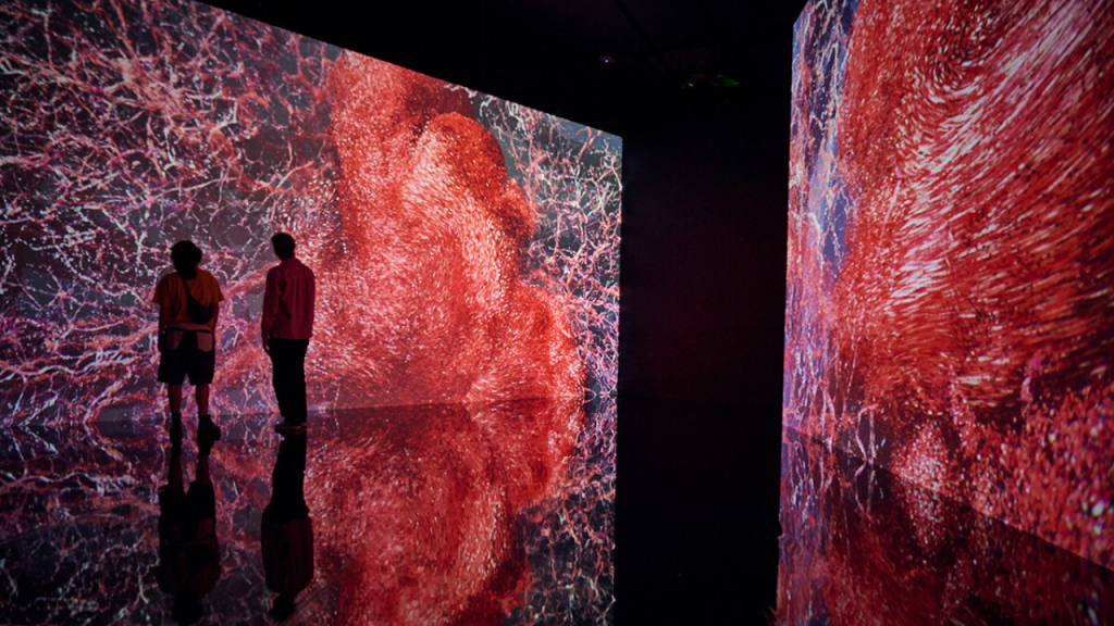 Di bagian tengah pameran, pengalaman tersebut berlanjut melalui karya imersif Evolver (2022) oleh kolektif seni berbasis London, Marshmallow Laser Feast. Melalui proyeksi berskala besar dan pengalaman virtual reality, pengunjung diajak mengikuti perjalanan oksigen di dalam tubuh; dari mulut hingga paru-paru, membuat sistem yang tak terlihat menjadi terasa nyata.