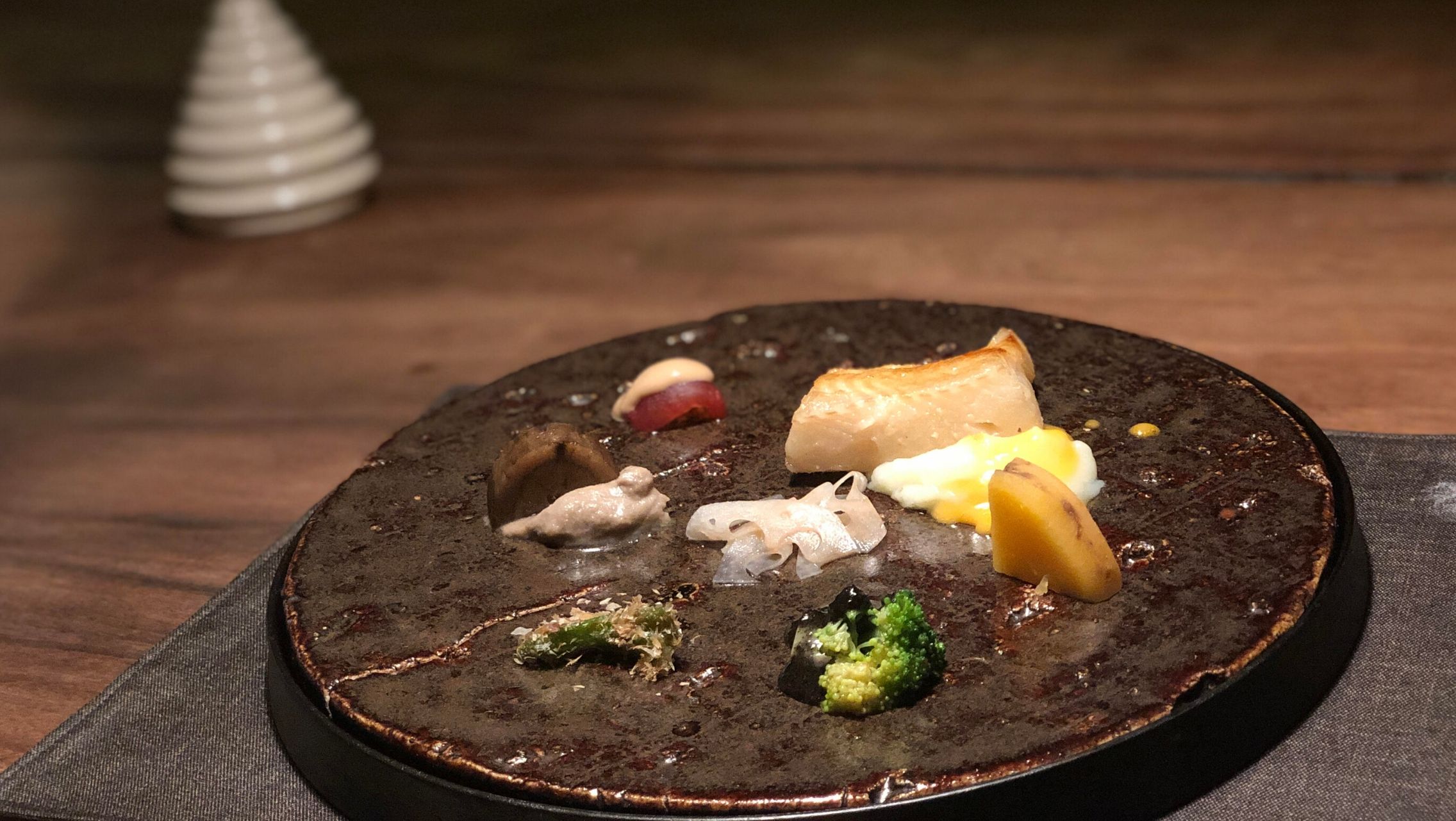 Hidangan yakimono yang terdiri dari Halibut Saikyou yaki dengan kentang dan krim kuning telur; tomat cherry dengan saus wijen putih; ketela Jepang dan puree ketela; ubi; lotus root; green chili miso; brokoli dan saus wijen hitam.