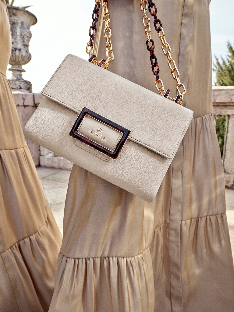Tak ketinggalan koleksi tas favorit dari Aigner yang hadir dalam modifikasi warna dan material terbaru. Pada seri tas Vicenza, hadir warna-warna netral seperti hitam, beige, dan off white. Aksen corak kulit penyu pada tali rantai dan buckle penutup memberi keindahan alami yang eklektik. Aksen corak kulit penyu ini juga menjadi aksen pada seri sepatu yang serasi.