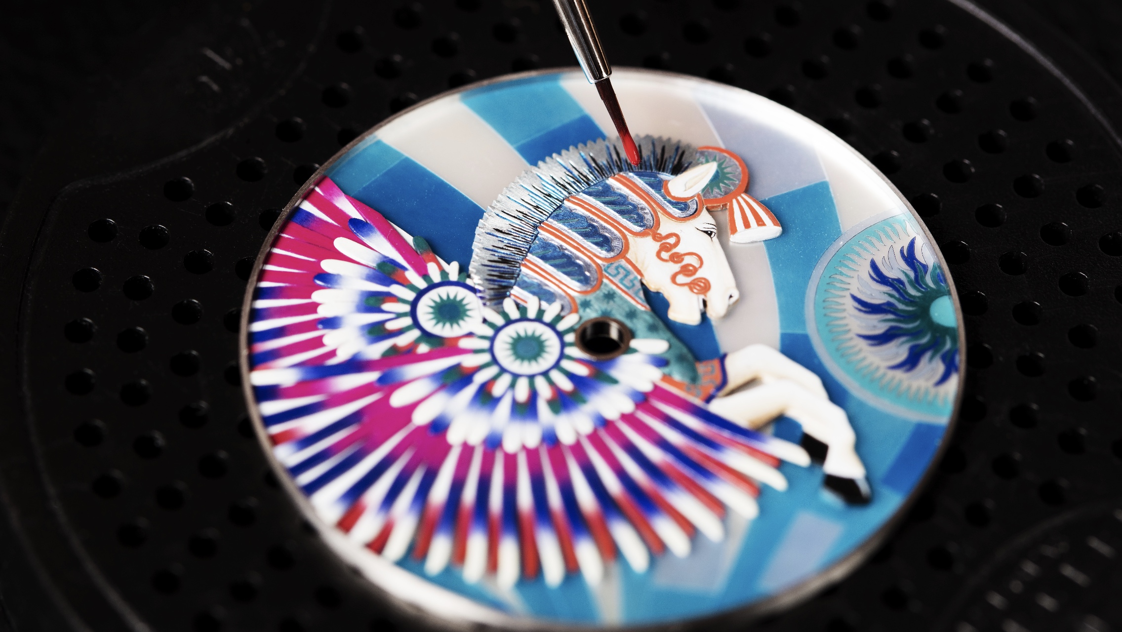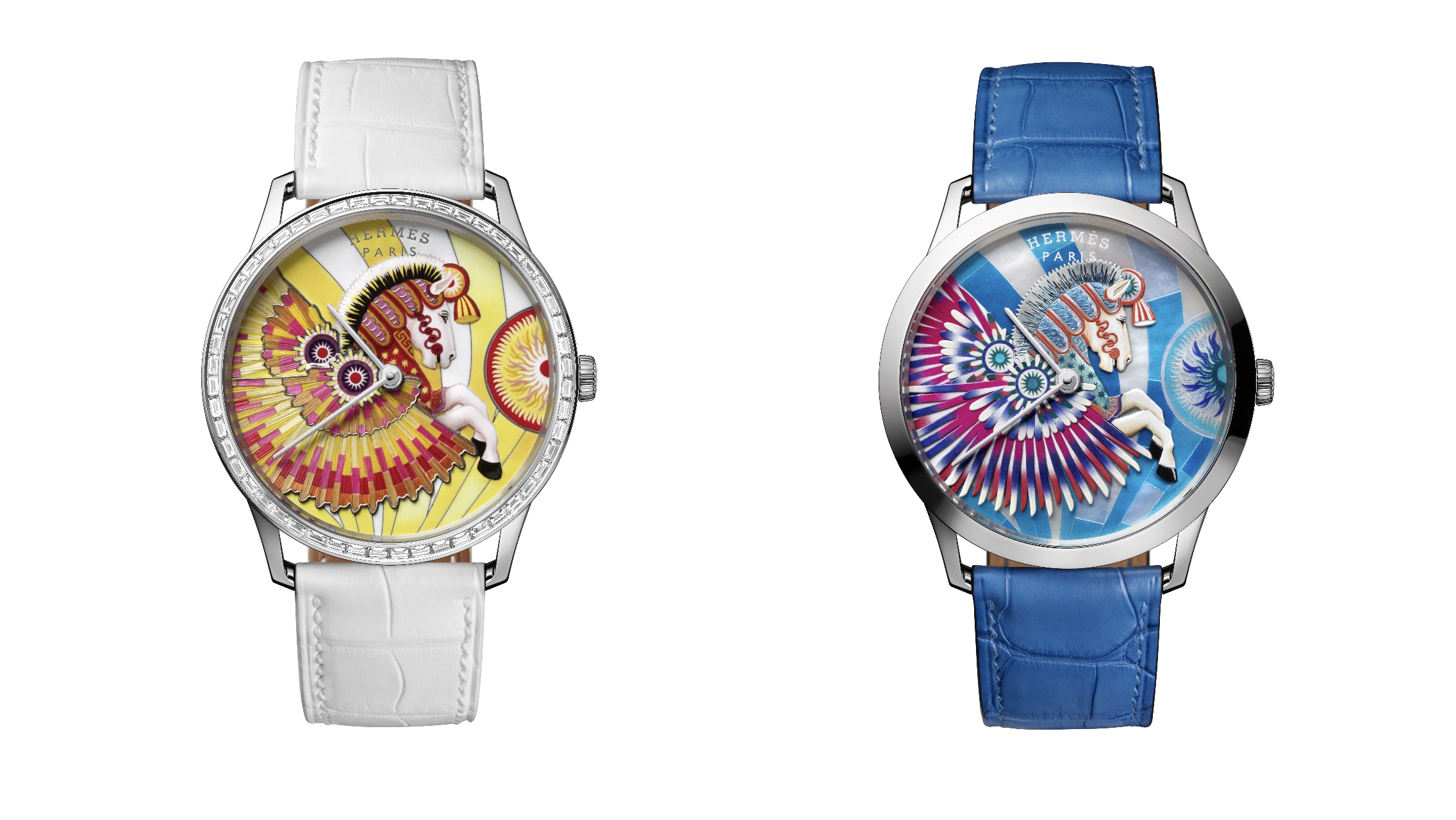 Awalnya simbol mitologi Pegasus dilukis indah di atas scarf Hermès oleh seniman Prancis, Pierre Marie. Mengetahui begitu banyak penggemar Hermès yang menggilai scarf tersebut, rasanya ide untuk membuat guratan fantasi ini pada lini horologi Hermès adalah hal yang brilian. Diciptakanlah dial dengan teknik enamel champlevé alveoli yang diisi oleh bubuk perwarna kaca dan minyak alami. Diproses dengan suhu di atas 800 derajat celsius untuk mendapatkan warna yang diinginkan. Keindahan dial berlatar warna kuning dan biru ini juga memiliki teknik artisan yang berbeda dengan segala kerumitannya masing-masing.