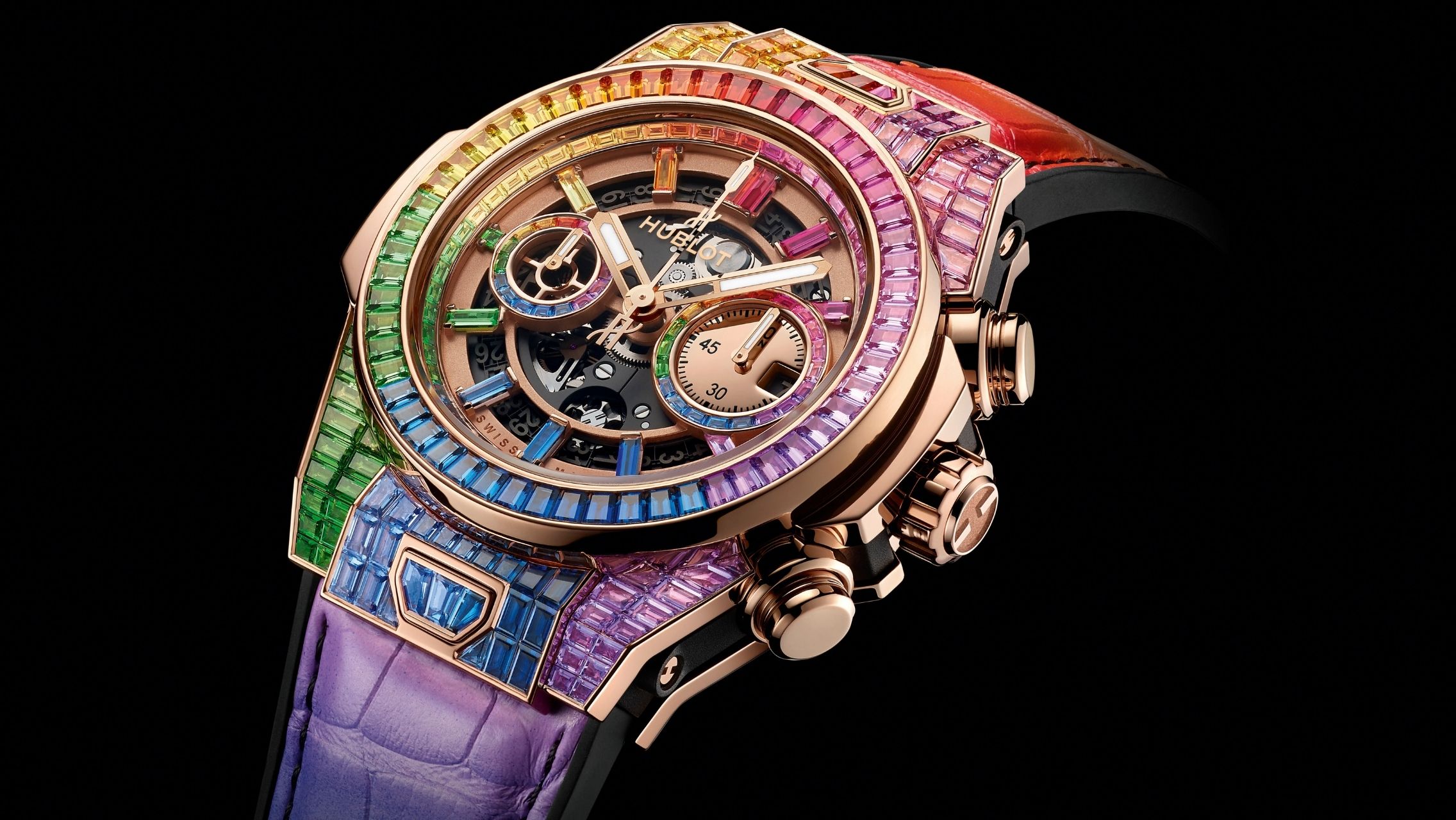Sebanyak 112 batu permata potongan baguette mengelilingi tepi bezel arloji ini. Dial jam tangan ini dilengkapi dengan Polished 18K King Gold Set dengan 100 batu permata antara lain rubi, safir merah muda, safir biru, topaz, ametis, dan tsavorites. Berdiameter 45 mm, arloji yang digerakkan oleh flyback chronograph HUB1242 pabrikan UNICO ini tahan air hingga 50 meter. Sebagai sentuhan akhir, tali kulit buaya juga dipasangkan dengan 30 batu permata.