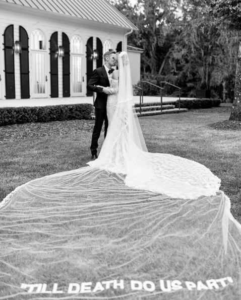 Dengan gaun pernikahan yang menjuntai di foto saat ia bersama Justin, Hailey menuliskan 'last Monday was the most special day of my life' dan di rumput tamannya terlihat tulisan 'Till Death Do Us Part!'.