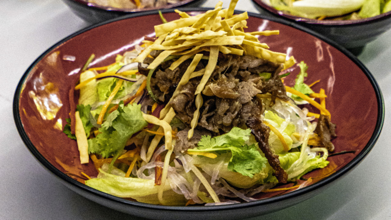 3. Campurkan bawang Bombay, wortel, kyuri, cabai merah besar, selada iceberg, dan daging rib-eye yang sudah ditumis tadi. Tambahkan dressing secukupnya dan taburkan kulit wonton yang sudah digoreng. Beri garnish dengan daun ketumbar.