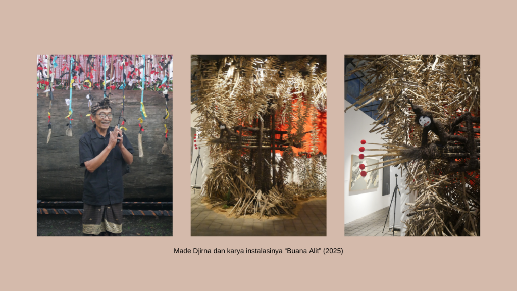 Instalasi ini terbagi dalam dua ruang konseptual: Buana Agung sebagai makrokosmos, dan Buana Alit sebagai mikrokosmos. Di dalam ruang kecil itu, Djirna meresapi perubahan tempat dan waktu: dari wilayah agraris yang dulu dekat dengan kehidupan lokal, menjadi ruang yang kini bergerak lebih luas dan kosmopolit.
