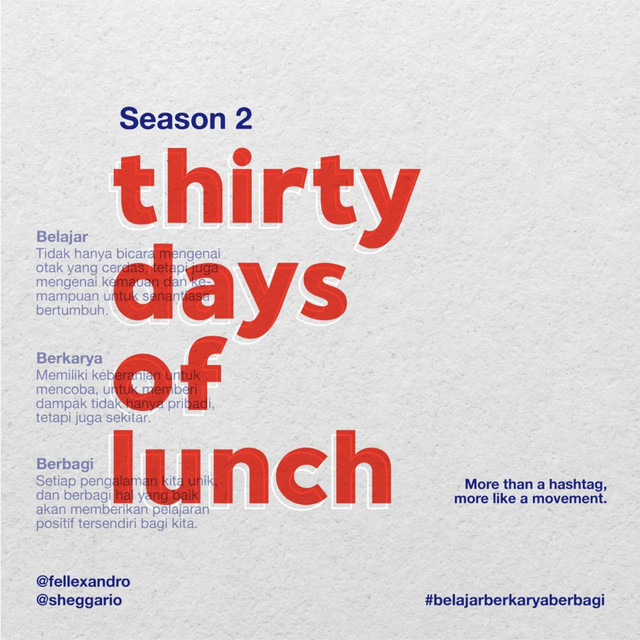 Thirty Days of Lunch membahas pelbagai ide, pengalaman, dan life hacks sehubungan dengan berbagai topik. Mulai dari pengembangan diri, bisnis, hubungan, karier, hingga teknologi. Berdasarkan pengalaman pribadi dari dynamic duo Ario Pratomo dan Fellexandro Ruby, podcast ini menyatukan pengalaman, ilmu, dan keahlian dari berbagai pembicara tamu dengan tips praktis yang relevan untuk permasalahan generasi ini.