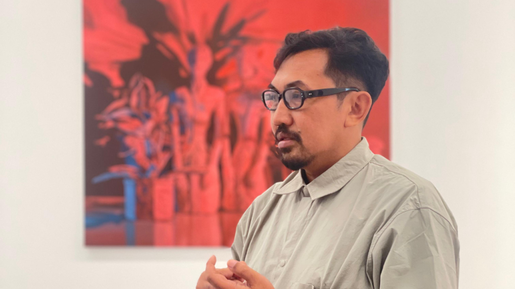 Latar belakang lukisan Wedhar justru berdenyut terang, dengan cahaya dan warna yang vibran hingga menyilaukan. Kontras ini melahirkan ketegangan antara yang natural dan yang artifisial—dua konteks yang memang sejak lama menjadi eksplorasi Wedhar. Jika sebelumnya ia bermain dengan potret manusia yang dipenuhi karakter komikal, kali ini ia menempatkan benda-benda sederhana di panggung yang terlampau “megah” dan sintetik.