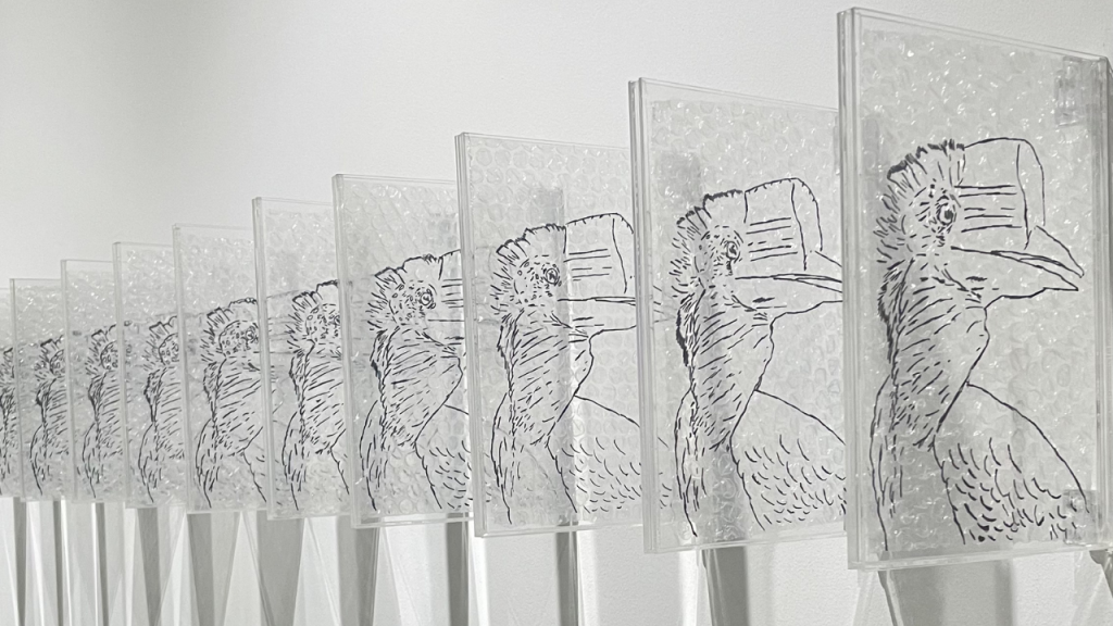 Digambar di atas bubble wrap yang menjadi simbol perdagangan global dan praktik jual beli, karya Rega Ayundya ini menjadi kritik atas bagaimana spesies bisa ‘dibungkus’ dan dipindahkan demi kepentingan manusia.