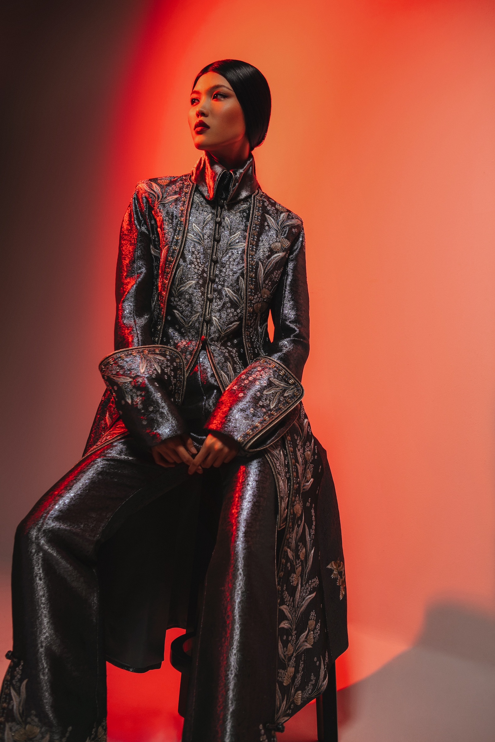 Kerah tinggi pada setelan jaket bertumpuk dan celana berpipa lebar dari material beludru abu-abu berkilau. Sulaman indah pada seluruh bagian busana menjadi pemikat yang sempurna. (Koleksi: Adrian Gan)