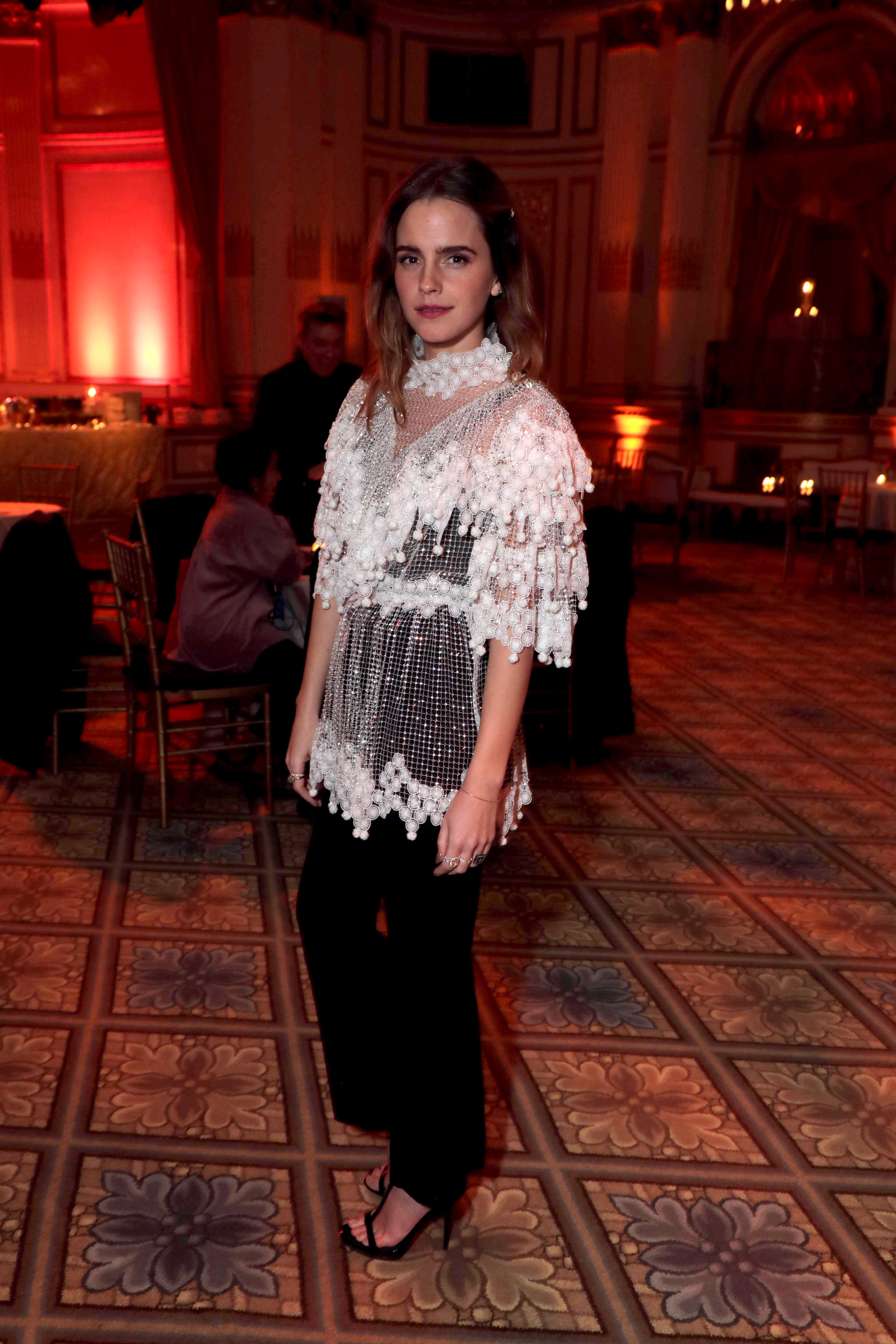 Karisma Emma Watson kian berbinar dengan atasan mesh yang dibuat dari jalinan benang bergelimang kristal dilengkapi lace dan sematan payet dari Burberry. Atasan yang cukup berkarakter itu lalu ia padankan dengan korset serta celana panjang wol hitam.
