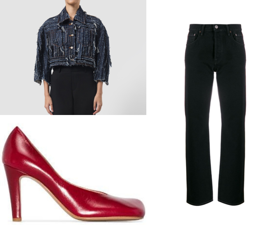 Padankan celana jeans Anda dengan kaus dan jaket jeans penuh statement seperti jaket jeans dari Toton yang satu ini. Pilih jeans warna gelap yang mempunyai kesan lebih formal ketimbang jeans warna biru terang. Sebagai pelengkap, kenakan sepatu pumps seperti sepatu merah dari Bottega Veneta ini untuk memberikan sentuhan akhir yang lebih sleek.
