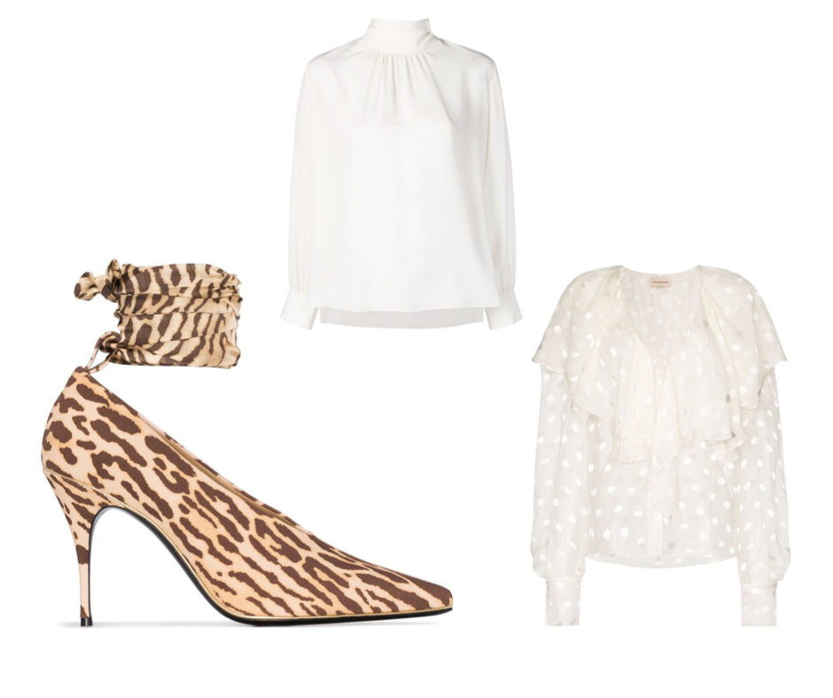 Padu padan lain untuk membuat celana jeans Anda terlihat lebih formal adalah dengan memasangkannya dengan atasan putih yang netral. Anda bisa memilih atasan tertutup yang konservatif untuk tampil klasik seperti blouse rilisan Fendi ini, atau Anda bisa tampil lebih sassy dengan atasan dari Alexandre Vauthier. Kombinasikan tampilan Anda itu dengan sepatu yang nampak berani seperti pumps dalam balutan motif animal print dari Zimmermann ini.