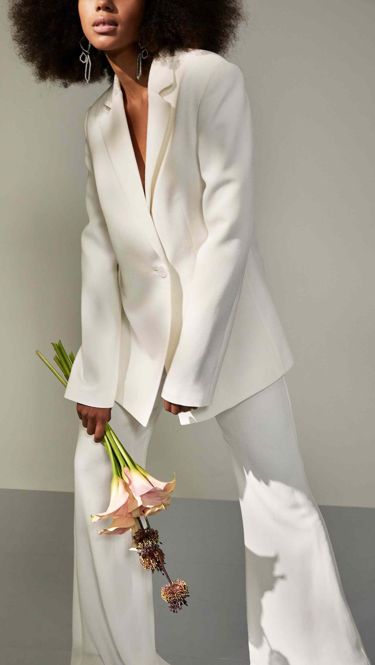 Mengintip dari brides.com, disebutkan bahwa salah satu tren gaun pernikahan di tahun 2022 bisa berupa satu set busana yang terdiri dari atasan dan bawahan, seperti blazer dan celana panjang. Kesan tradisional yang sering terpancar dari gaun pernikahan kebanyakan pun dapat Anda patahkan dengan busana pernikahan seperti ini.