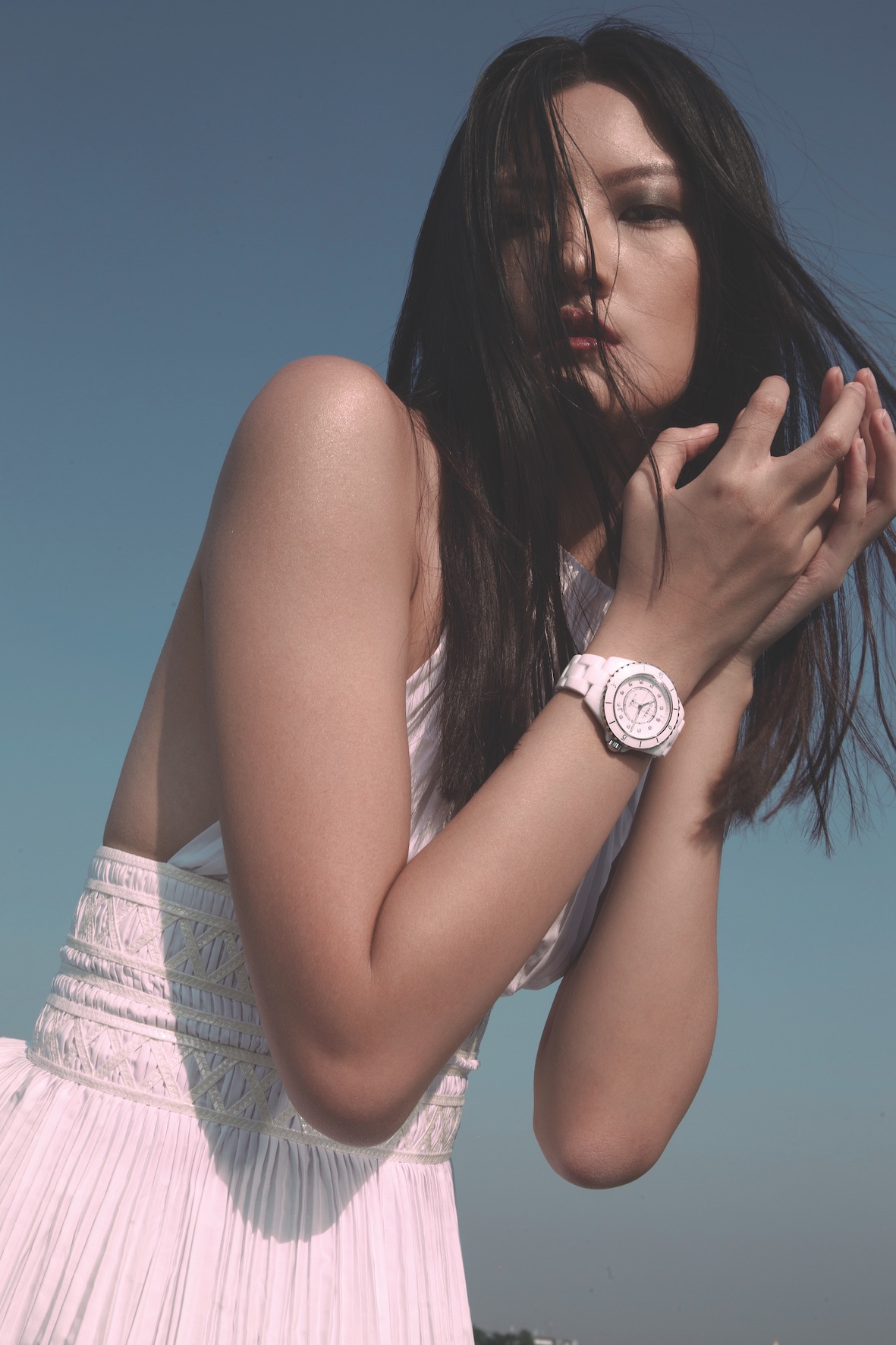 Atau desain anggun nan kasual jam tangan J12 Chanel yang nampak serasi melengkapi padanan atasan putih tanpa lengan dengan detail lipit di bagian bawah.